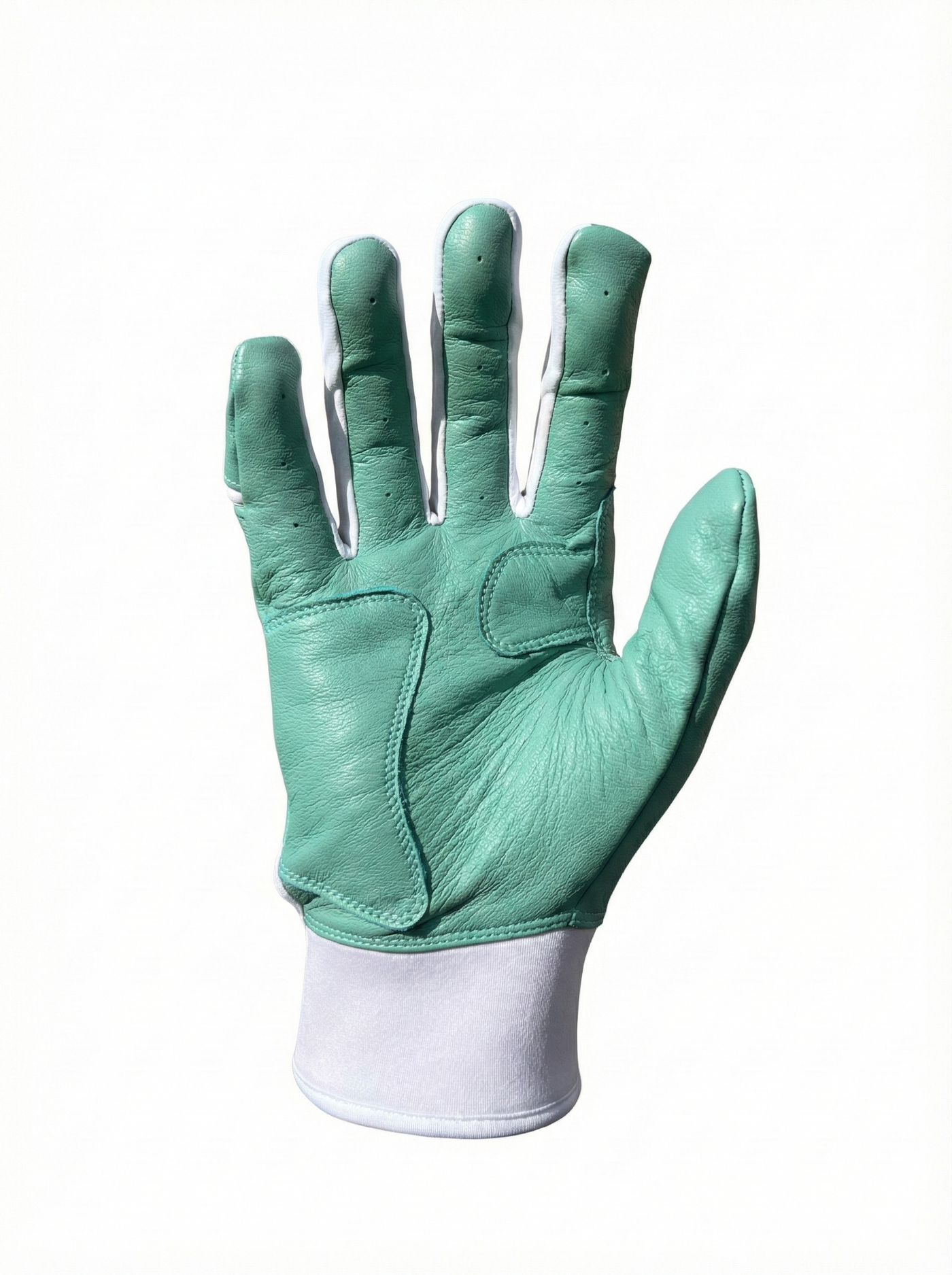 Don’t let the style fool you—the Aqua Mint & White Short Cuff gloves are built for serious wear. The FlashGrip palm design reinforces high-stress zones with a second layer of premium Cabretta. That means no cracking, no slipping, no excuses—just smooth, responsive feel every swing, every time.